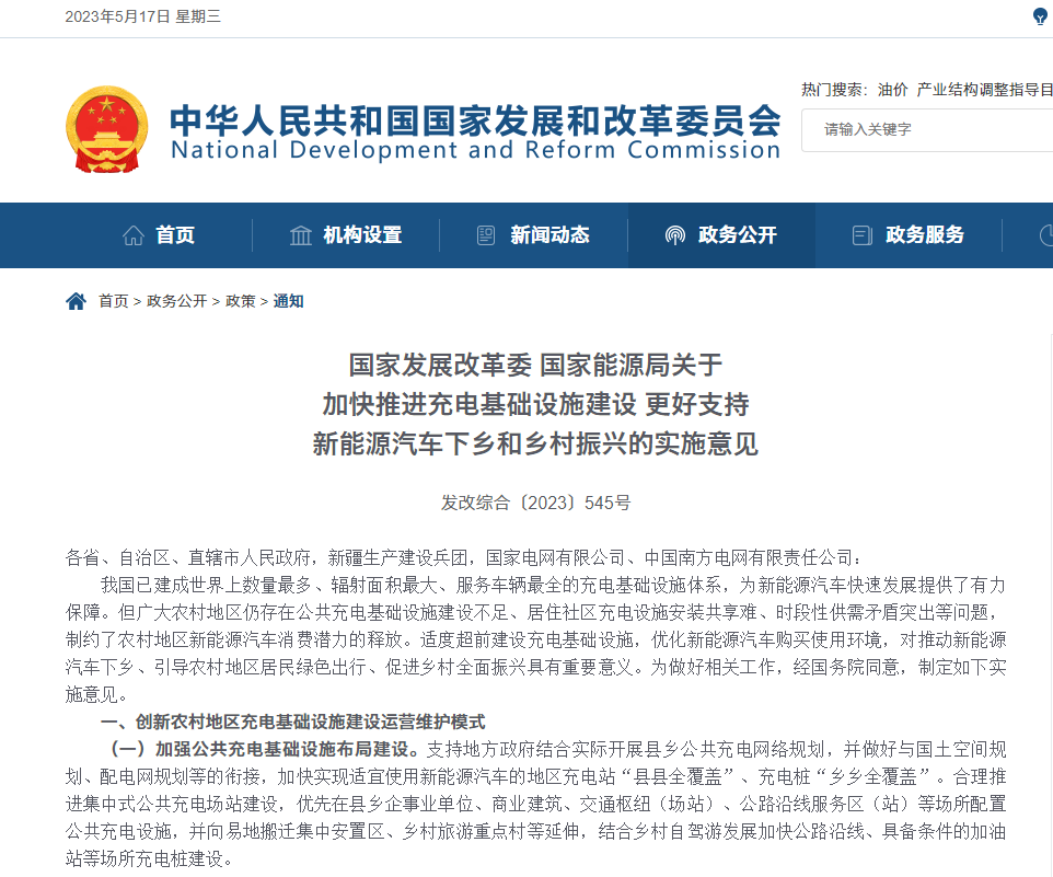 5月17日:国家开展和改革委员会官网发布《国家开展改革委 国家能源局关于加快推进充电基础设施建设 更好支持新能源汽车下乡和乡村振兴的实施意见》,《意见》中提到的适度超前建设充电基础设施,优化新能源汽车购买使用环境,加快实现适宜使用新能源汽车的地区充电站“县县全覆盖”、充电桩“乡乡全覆盖”等信息。